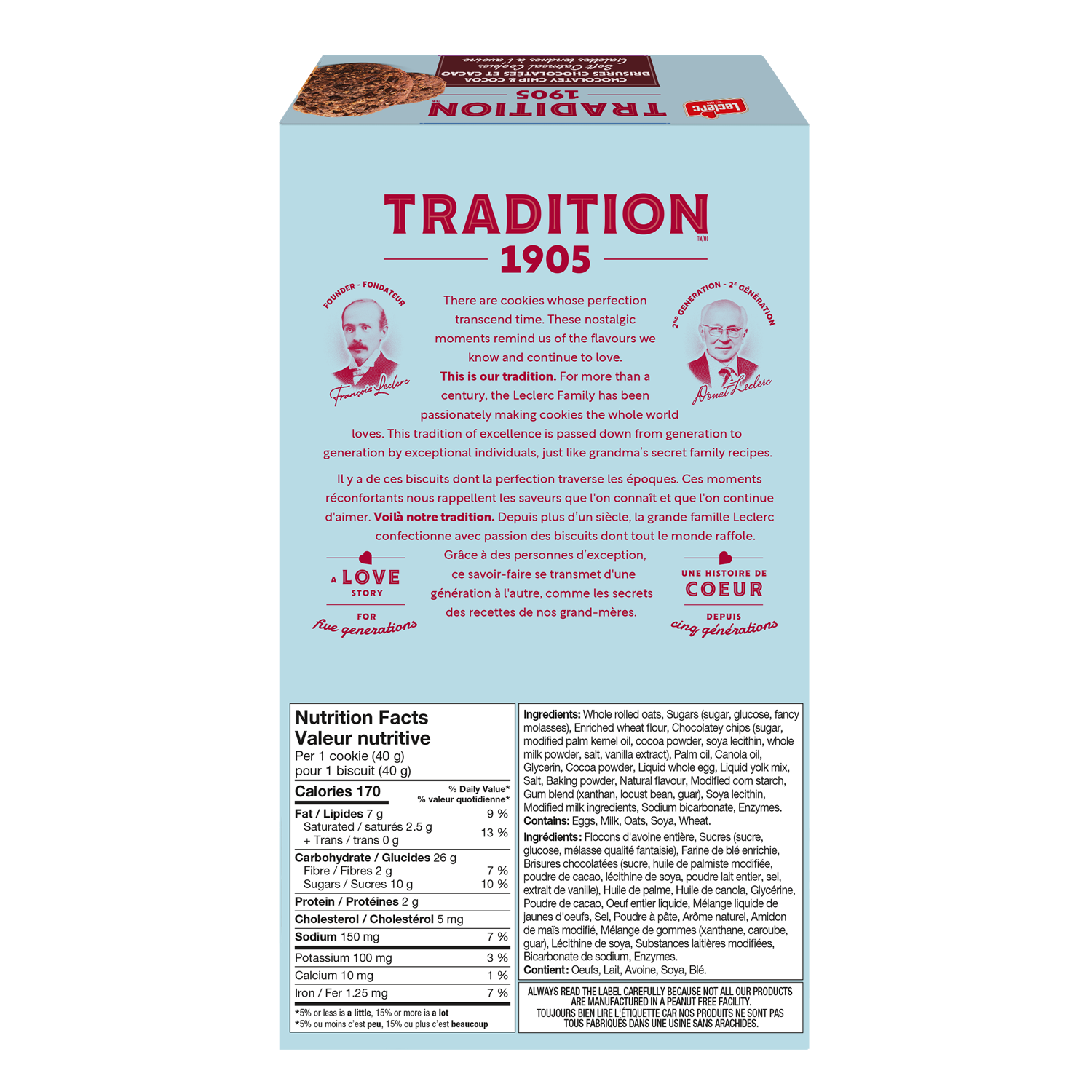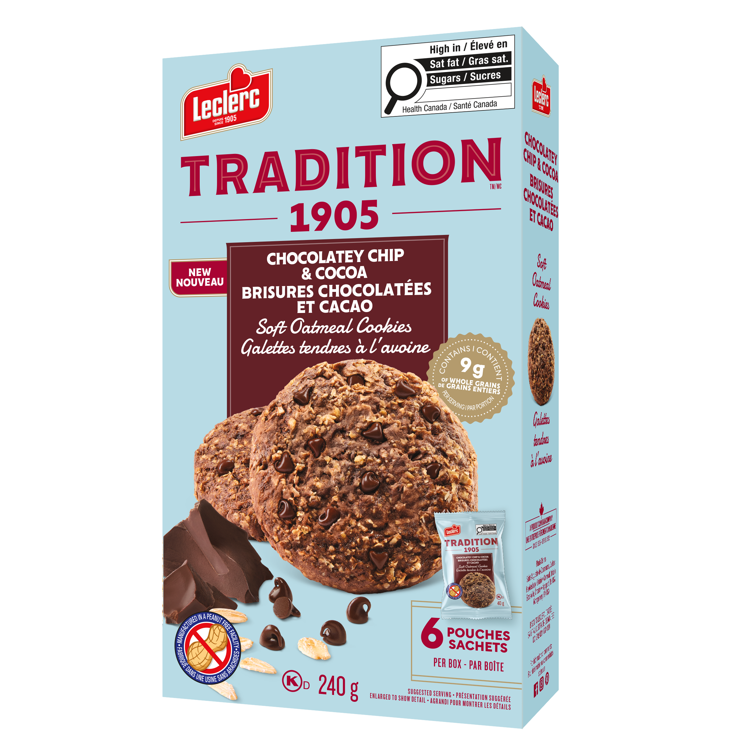 Whole rolled oats • Sugars (sugar, glucose, fancy molasses) • Enriched wheat flour • Dark chocolate flavoured chips (sugar, modified palm kernel oil, cocoa powder, soya lecithin, whole milk powder, salt, vanilla extract) • Palm oil • Canola oil • Glycerin • Cocoa powder • Liquid whole egg • Liquid yolk mix • Salt • Baking powder • Natural flavour • Modified corn starch • Gum blend (xanthan, locust bean, guar) • Soya lecithin • Modified milk ingredients • Sodium bicarbonate • Enzymes