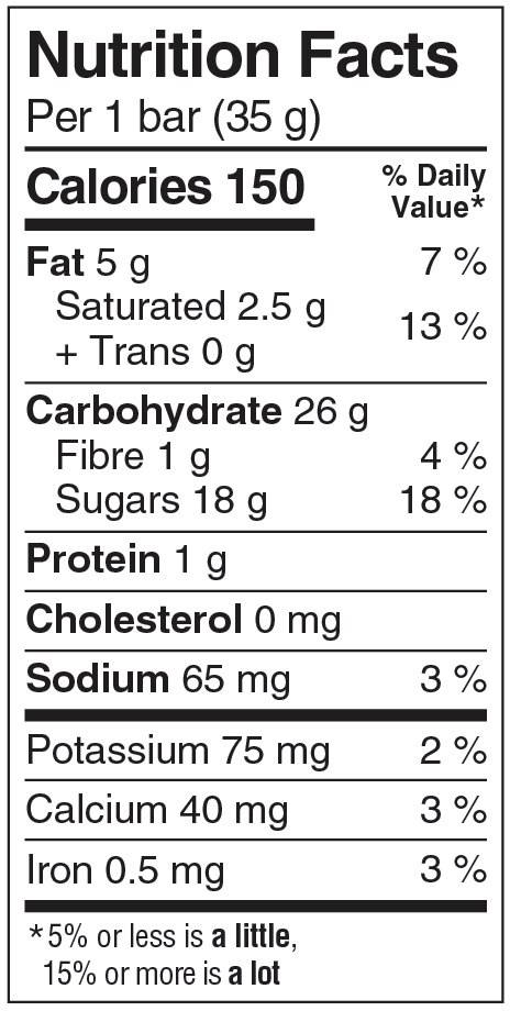 Sugars (glucose, sugar, icing sugar, fructose, honey, dry malt extract [barley]), Milk chocolate (sugar, cocoa butter, chocolate liquor, milk ingredients, soya lecithin, vanilla extract), Frosted crisp rice (rice flour, sugar, canola oil, calcium carbonate, salt, fancy molasses, sodium bicarbonate, soya lecithin), Chocolatey fudge fondant (sugar, glucose, coconut oil, cocoa powder, modified milk ingredients, water, monoglycerides, soya lecithin, vanilla extract), Whole rolled oats, Canola oil, Glycerin, Cocoa powder, Modified milk ingredients, Wheat starch, Natural flavour, Salt, Soya lecithin, Beet red, Almond butter, Peanut butter, Cashew butter, Sunflower oil.