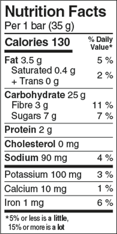 Sugars (tapioca syrup, date paste), Whole rolled oats, Whole wheat flour, Canola oil, Oat hull fibre, Dehydrated apples, Natural flavour, Salt, Cinnamon, Sodium bicarbonate, Soya lecithin, Modified milk ingredients. Contains: Milk, Oats, Soya, Wheat.