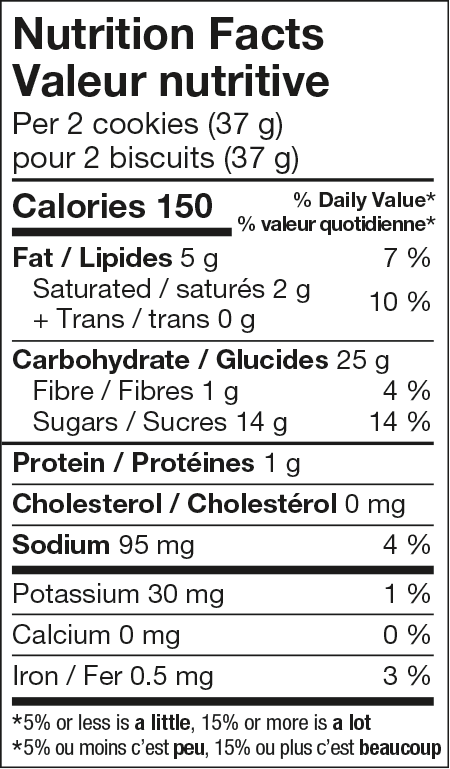 Cookie (enriched wheat flour, sugar, canola oil, whole rolled oats, palm oil, mono and diglycerides, sodium bicarbonate, soya lecithin, salt, artificial flavour, modified milk ingredients, sodium propionate, spices), Raspberry filling (sugar, glucose, raspberry puree, water, glucose-fructose, coconut oil, pectin, natural flavour, citric acid, black carrot concentrate, agar, sodium citrate, sodium benzoate, potassium sorbate).