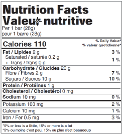 Sucres (pommes déshydratées, sirop de maïs, pâte de dattes, fructose, miel), Flocons d'avoine entière, Huile de canola, Glycérine végétale, Fraises déshydratées, Arôme naturel, Lécithine de soya, Rouge de betterave, Sel, Flocons de blé, Substances laitières modifiées.