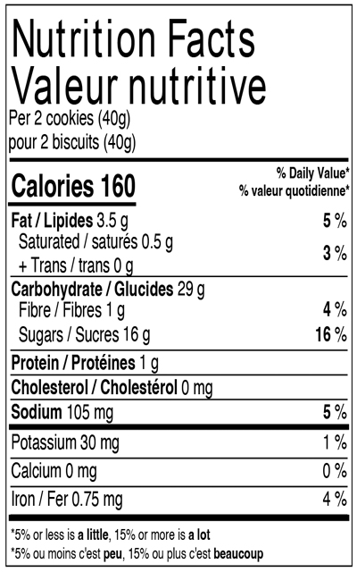 Biscuit (farine de blé enrichie, sucre, huile de canola, mono et diglycérides, mélasse qualité fantaisie, bicarbonate de sodium, sel, lécithine de soya, arôme naturel, substances laitières modifiées, tartrazine et jaune soleil fcf et rouge allura), Garniture aux pommes (purée de pommes, glucose, sucre, glucose-fructose, pectine, acide citrique, sorbate de potassium, rouge allura). Contient : Lait, Soya, Blé.