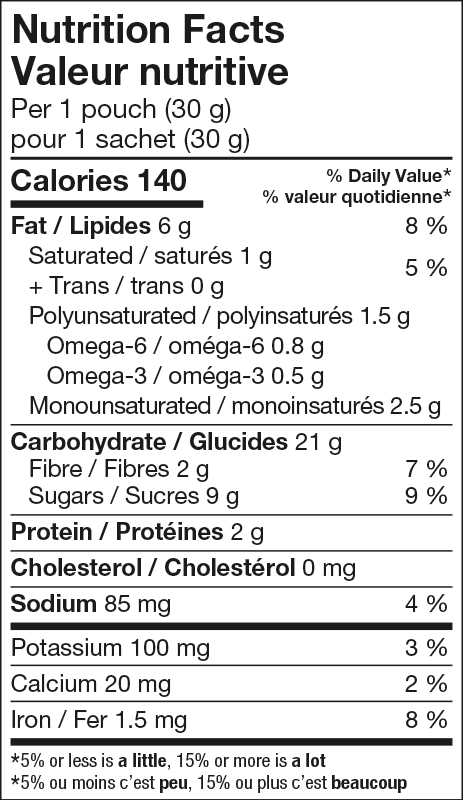 Mélange d'avoine ( flocons d'avoine entière, farine d'avoine entière), Cassonade, Farine de blé enrichie, Huile de canola, Brisures de chocolat noir 70% cacao (liqueur de chocolat, sucre, dextrose, lécithine de soya, extrait de vanille), Canneberges déshydratées (sucre, canneberges, huile de tournesol), Poudre de cacao, Graines de chia moulues, Arôme naturel, Sel, Bicarbonate de sodium, Substances laitières modifiées.