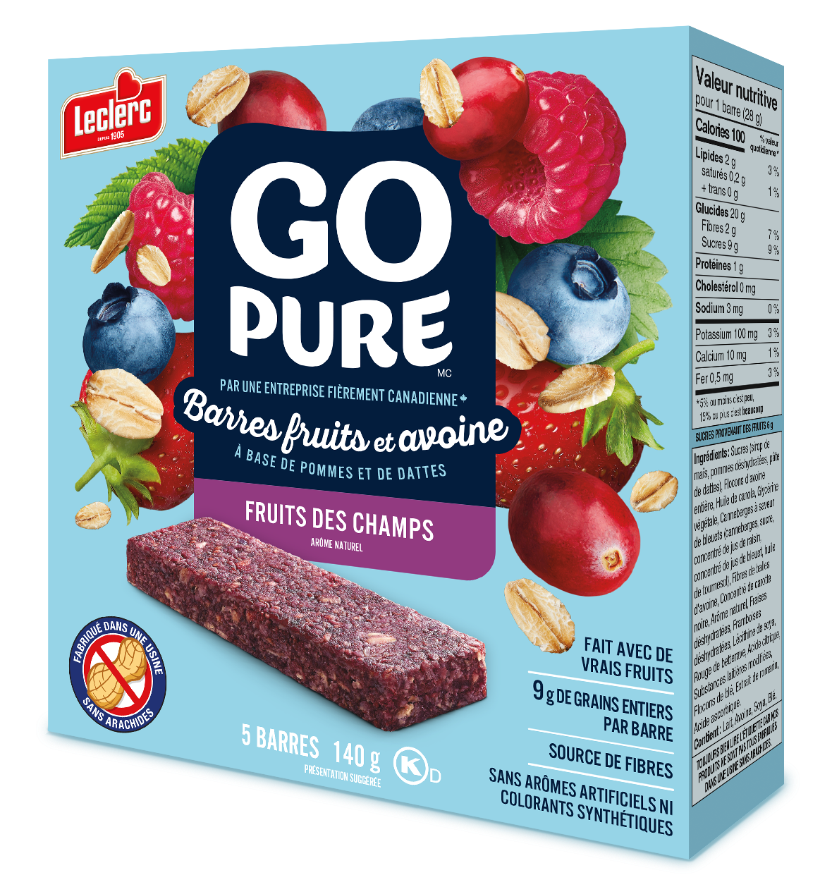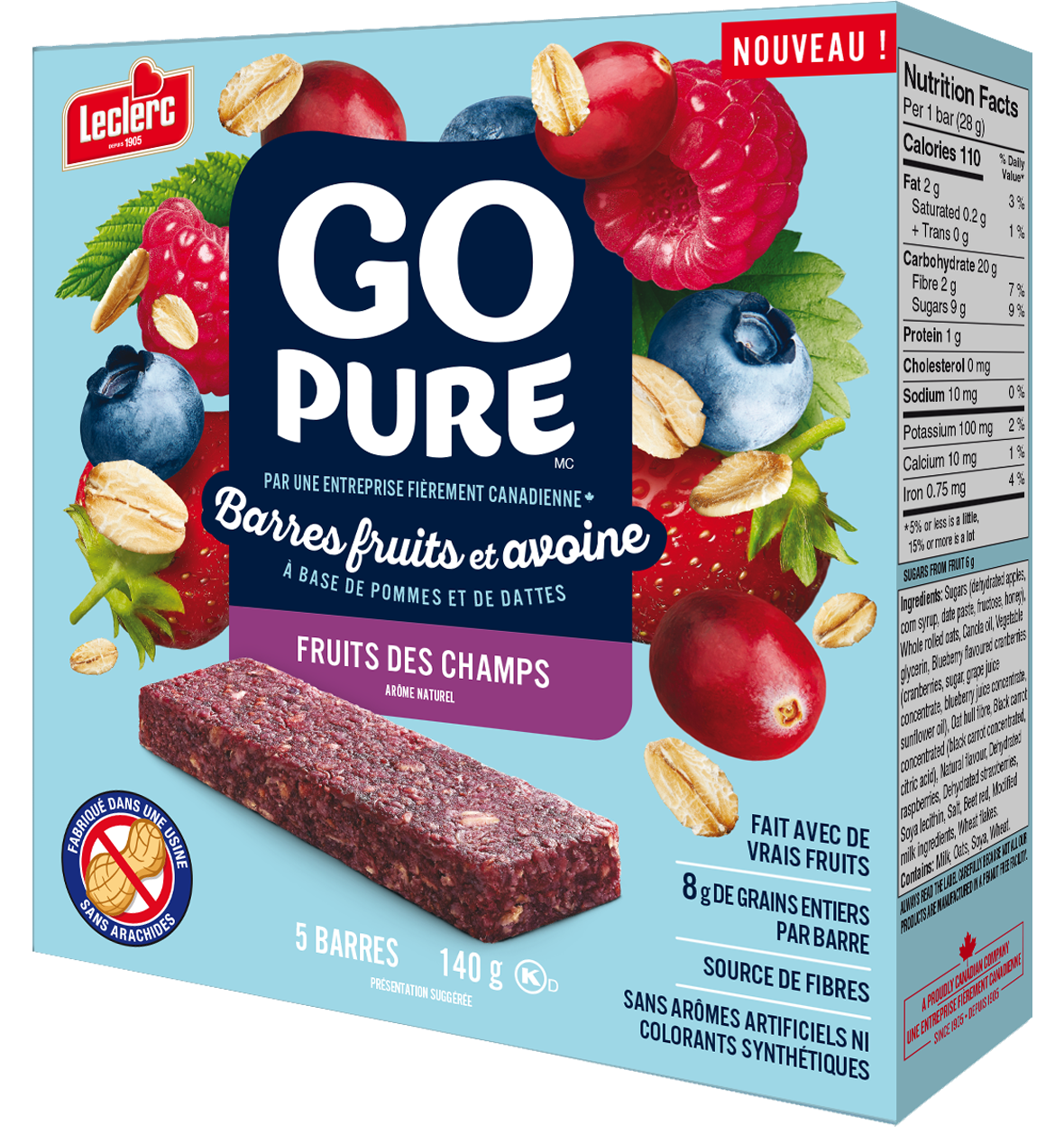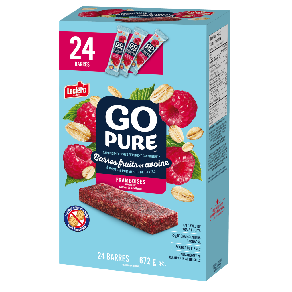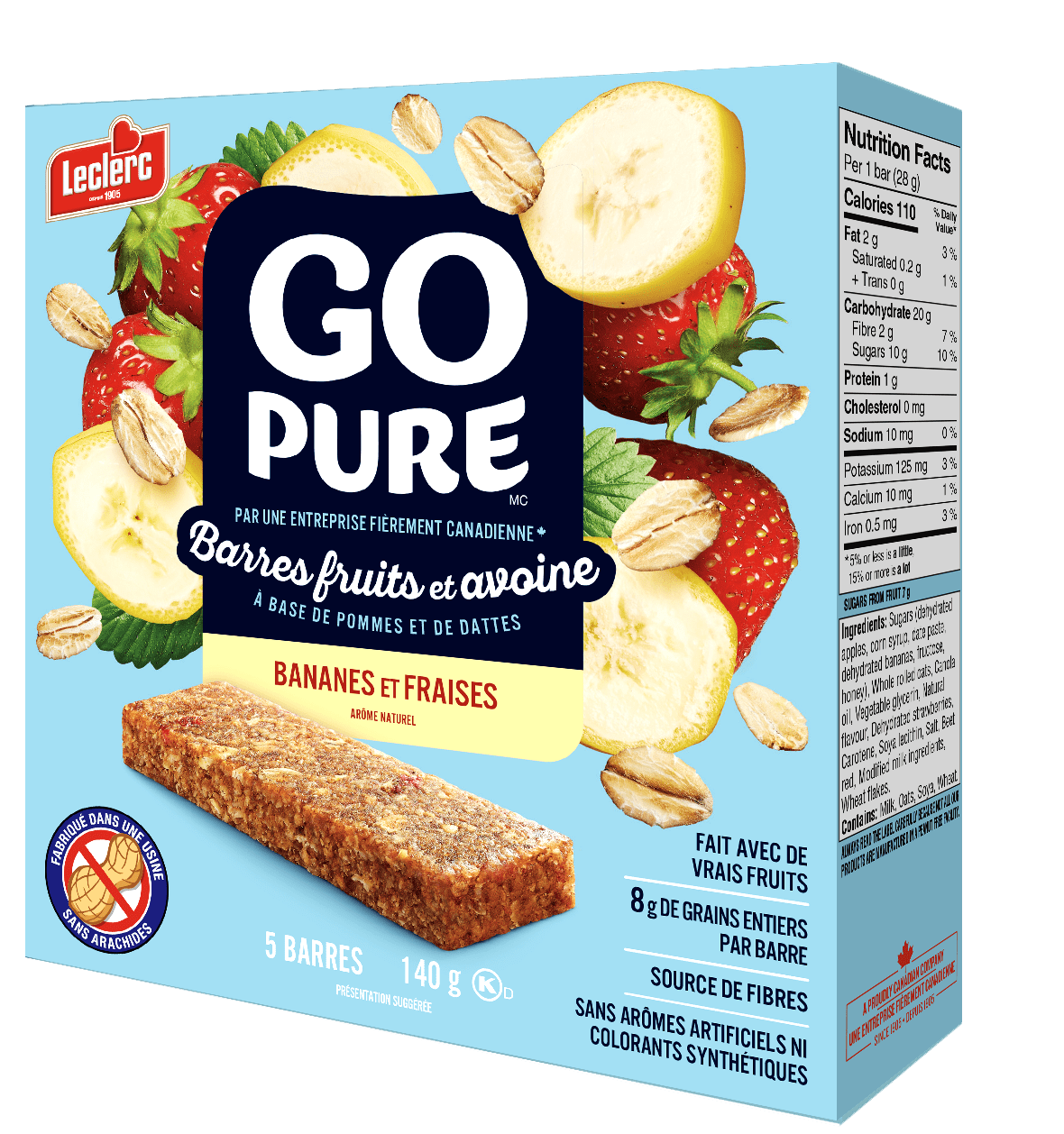 Le goût savoureux des bananes et fraises bien mélangé avec les bienfaits de l’avoine. Une barre innovante et santé, faite avec de vrais fruits qui contient 8 g de grains entiers, et est une source de fibres. Elle est certifiée sans arachides et parfaite pour la boîte à lunch! Go Pure, Purement bon!