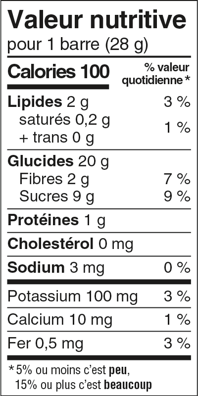 Sucres (sirop de maïs, pommes déshydratées, pâte de dattes), Flocons d'avoine entière, Huile de canola, Glycérine végétale, Canneberges à saveur de bleuets (canneberges, sucre, concentré de jus de raisin, concentré de jus de bleuet, huile de tournesol), Fibres de balles d'avoine, Concentré de carotte noire, Arôme naturel, Fraises déshydratées, Framboises déshydratées, Lécithine de soya, Rouge de betterave, Acide citrique, Substances laitières modifiées, Flocons de blé, Extrait de romarin, Acide ascorbique