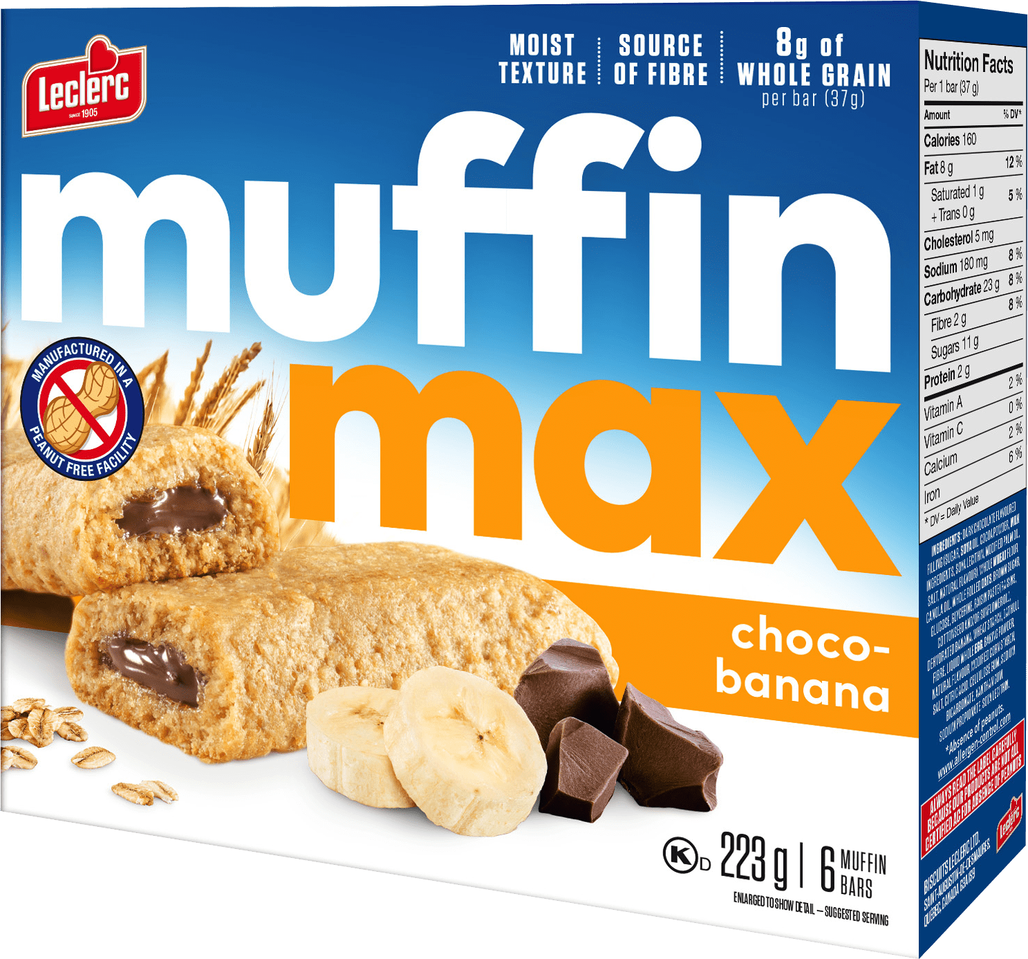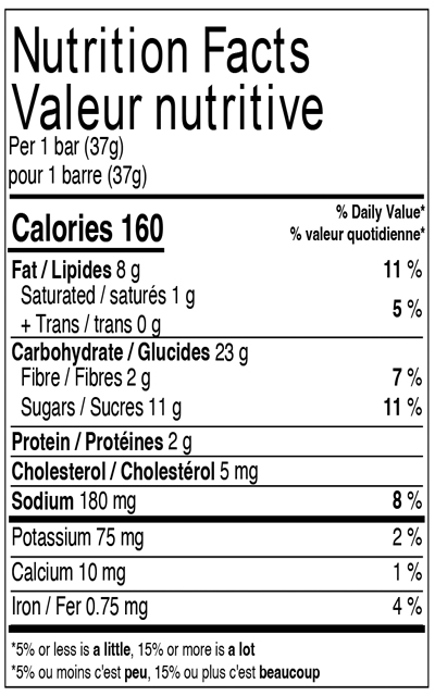 Muffin (farine de blé entier, huile de canola, flocons d'avoine entière, cassonade, glucose, glycérine, pâte de raisins secs [raisins secs, huile de tournesol], bananes déshydratées, amidon de blé, fibres de balles d'avoine, oeuf entier liquide, poudre à pâte, arôme naturel, sel, acide citrique, gomme de cellulose, amidon de maïs modifié, bicarbonate de sodium, gomme de xanthane, propionate de sodium, lécithine de soya), Garniture (sucre, huile de soya, poudre de cacao, substances laitières, lécithine de soya, huile de palme modifiée, sel, arôme naturel).