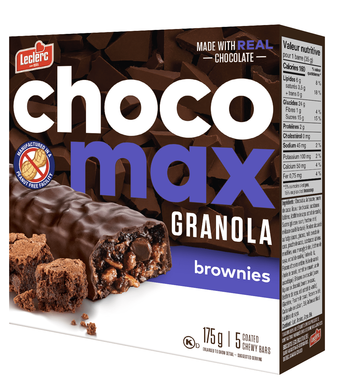 Chocolat au lait (sucre, beurre de cacao, liqueur de chocolat, substances laitières, lécithine de soya, extrait de vanille), Sucres (glucose, sucre, fructose, miel, mélasse qualité fantaisie), Fondant chocolaté au fudge (sucre, glucose, huile de noix de coco, poudre de cacao, substances laitières modifiées, eau, monoglycérides, lécithine de soya, extrait de vanille), Farine de riz, Flocons d'avoine entière, Huile de canola (huile de canola, extrait de romarin, acide ascorbique), Brisures de chocolat (sucre, liqueur de chocolat, beurre de cacao, lécithine de soya, sel, extrait de vanille), Glycérine, Poudre de cacao, Flocons de blé, Carbonate de calcium, Sel, Arôme artificiel, Lécithine de soya.