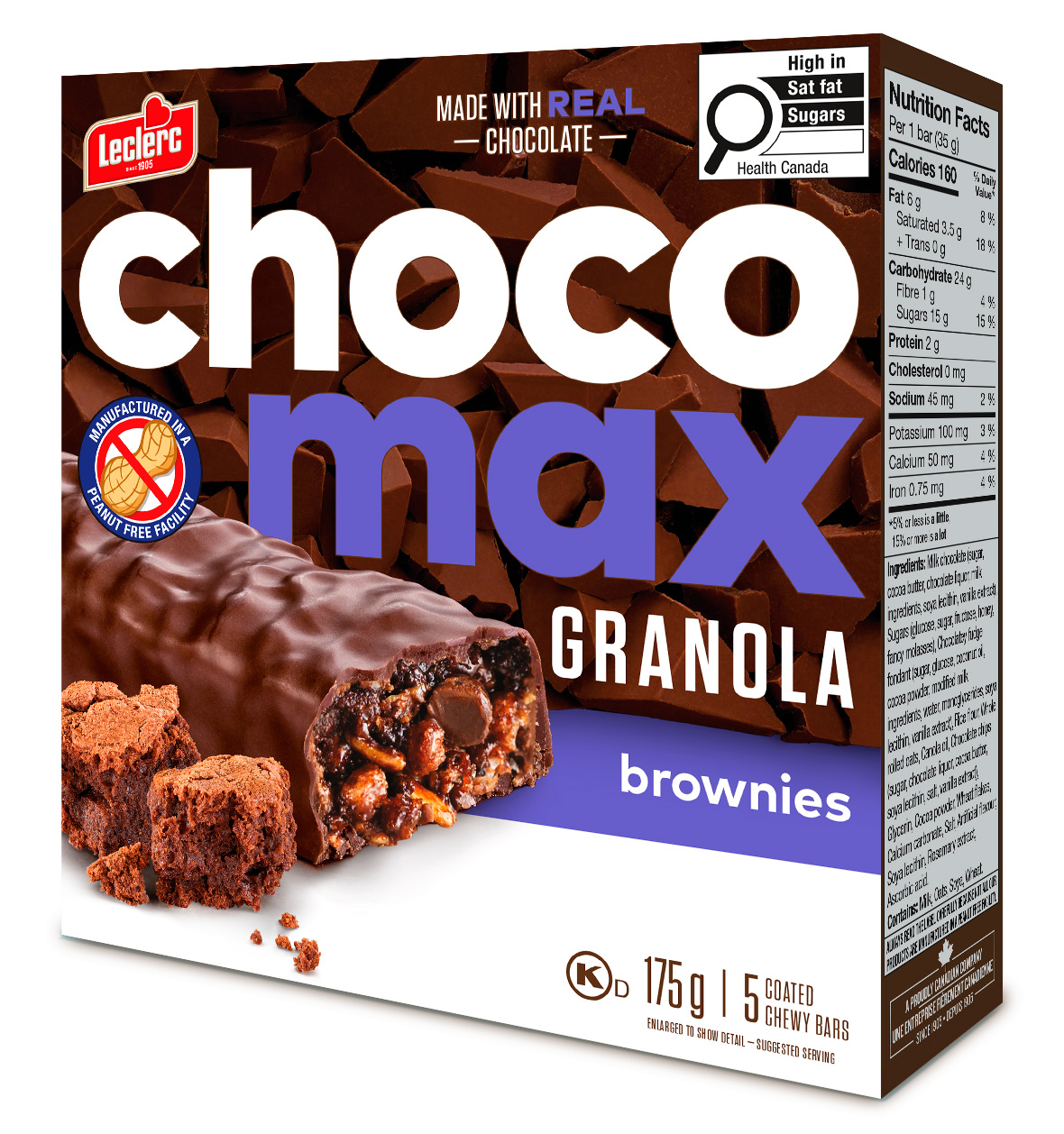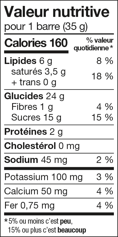 Chocolat au lait (sucre, beurre de cacao, liqueur de chocolat, substances laitières, lécithine de soya, extrait de vanille), Sucres (glucose, sucre, fructose, miel, mélasse qualité fantaisie), Fondant chocolaté au fudge (sucre, glucose, huile de noix de coco, poudre de cacao, substances laitières modifiées, eau, monoglycérides, lécithine de soya, extrait de vanille), Farine de riz, Flocons d'avoine entière, Huile de canola, Brisures de chocolat (sucre, liqueur de chocolat, beurre de cacao, lécithine de soya, sel, extrait de vanille), Glycérine, Poudre de cacao, Flocons de blé, Carbonate de calcium, Sel, Arôme artificiel, Lécithine de soya, Extrait de romarin, Acide ascorbique.