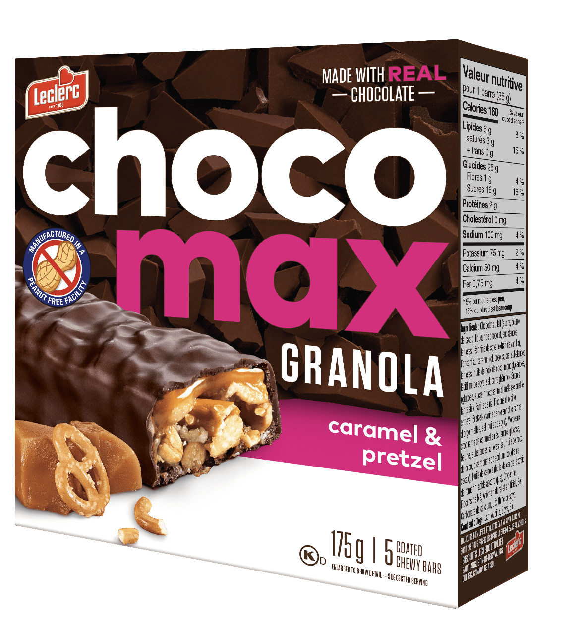 Barres enrobées de vrai chocolat. Le mix parfait de granola, de caramel et de bretzel pour satisfaire ce petit creux peu importe l'heure de la journée. En plus, elles sont certifiées sans arachides!