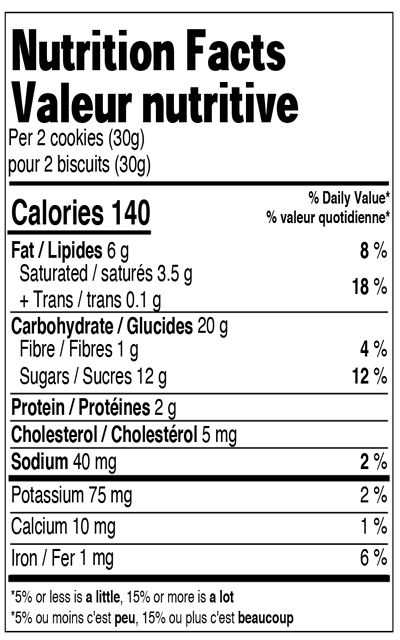 Chocolat noir 45% cacao (sucre, liqueur de chocolat, beurre de cacao, substances laitières, lécithine de soya, extrait de vanille), Farine de blé enrichie, Garniture aux bleuets (sucre, eau, glucose, glucose-fructose, purée de bleuets, arôme naturel, pectine, acide citrique, concentré de carotte noire [concentré de carotte noire, acide citrique], sorbate de potassium, benzoate de sodium, agar-agar), Sucre, Beurre (lait), Sel, Bicarbonate de sodium, Lécithine de soya, Arôme artificiel.