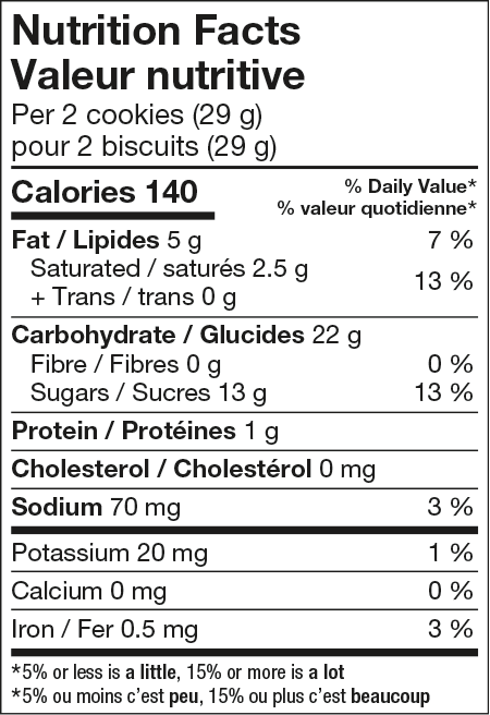 Biscuit (farine de blé enrichie, sucre, huile de palme, sel, bicarbonate de sodium, lécithine de soya, arôme artificiel, substances laitières), Crème (sucre, huile de palme, lécithine de soya, arôme artificiel, caramel). Contient : Lait, Soya, Blé.