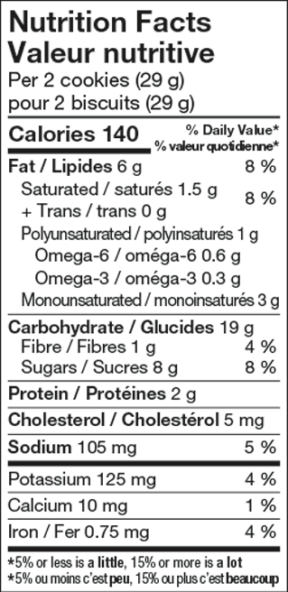 Farine de blé enrichie, Sucres (cassonade, sucre, pâte de raisins secs), Flocons d'avoine entière, Huile de canola, Huile de palme, Oeuf entier liquide, Sel, Arôme naturel, Bicarbonate de potassium, Poudre à pâte, Huile de tournesol à teneur élevée en acide oléique, Épices, Lécithine de soya, Substances laitières modifiées. Contient : Œufs, Lait, Avoine, Soya, Blé.