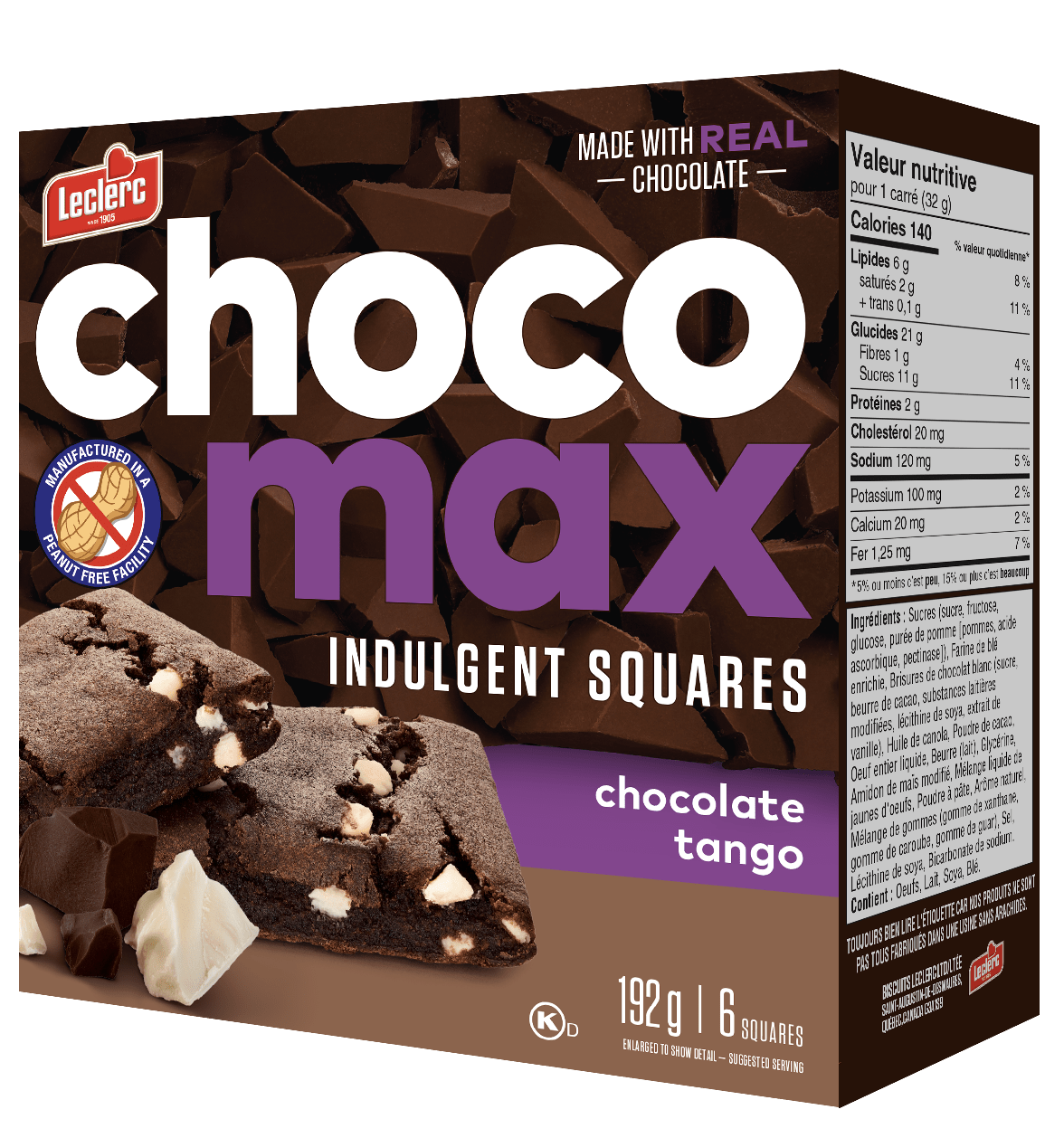 Sucres (sucre, fructose, glucose, purée de pomme [pommes, acide ascorbique, pectinase]), Farine de blé enrichie, Brisures de chocolat blanc (sucre, beurre de cacao, substances laitières modifiées, lécithine de soya, extrait de vanille), Huile de canola, Poudre de cacao, Oeuf entier liquide, Beurre (lait), Glycérine, Amidon de maïs modifié, Mélange liquide de jaunes d'oeufs, Poudre à pâte, Arôme naturel, Mélange de gommes (gomme de xanthane, gomme de caroube, gomme de guar), Sel, Lécithine de soya, Bicarbonate de sodium.